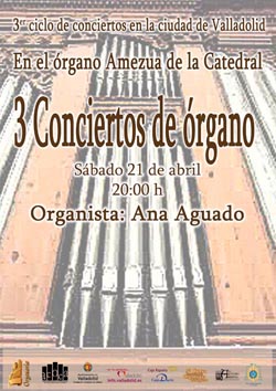 El sábado día 21 de Abril en la Catedral de Valladolid a las 20:00 h. inauguramos el III Ciclo de Conciertos en la Ciudad de Valladolid de la Asociación Cultural ORGANARIA de Castilla y León. La organista invidada es Ana Aguado.