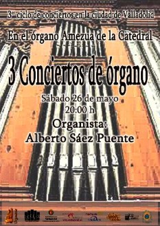 El sábado día 26 de mayo en la Catedral de Valladolid a las 20:00 h. se celebrará el 2º de los conciertos de órgano dentro del III Ciclo de Conciertos en la Ciudad de Valladolid de la Asociación Cultural ORGANARIA de Castilla y León. El organista invidado es Alberto Sáez Puente.